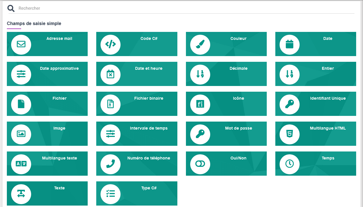 Dans cette partie, il faut choisir le type de champ. La liste peut être impressionnante au premier abord, mais elle est facile à utiliser. La zone de recherche en haut permet de trouver rapidement ce que l'on veut.