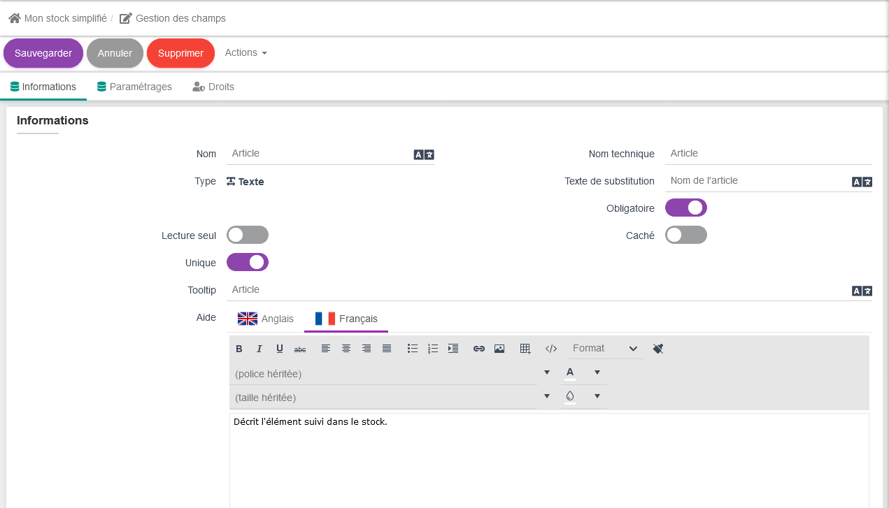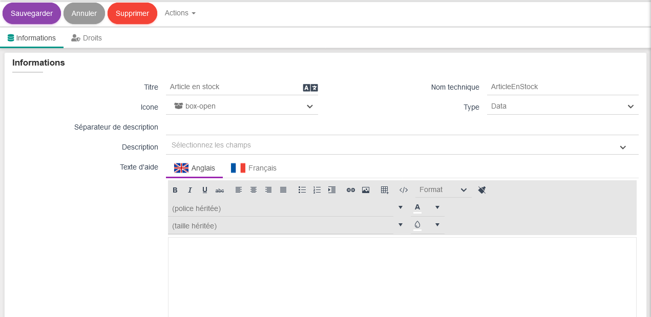 qui sera la base de l'aide disponible dans la documentation en ligne qui sera générée dans l'application. Encore une fois rien d'obligatoire, mais il c'est une bonne pratique de s'astreindre à remplir les textes d'aide le plus tôt possible car cela facilite fortemment la prise en main pour les utilisateurs. Cette aide est multilangue et la liste des langues à remplir dépend du paramétrage global linguistique de la plateforme.