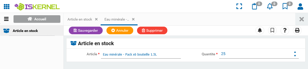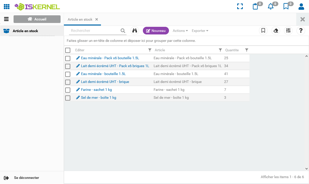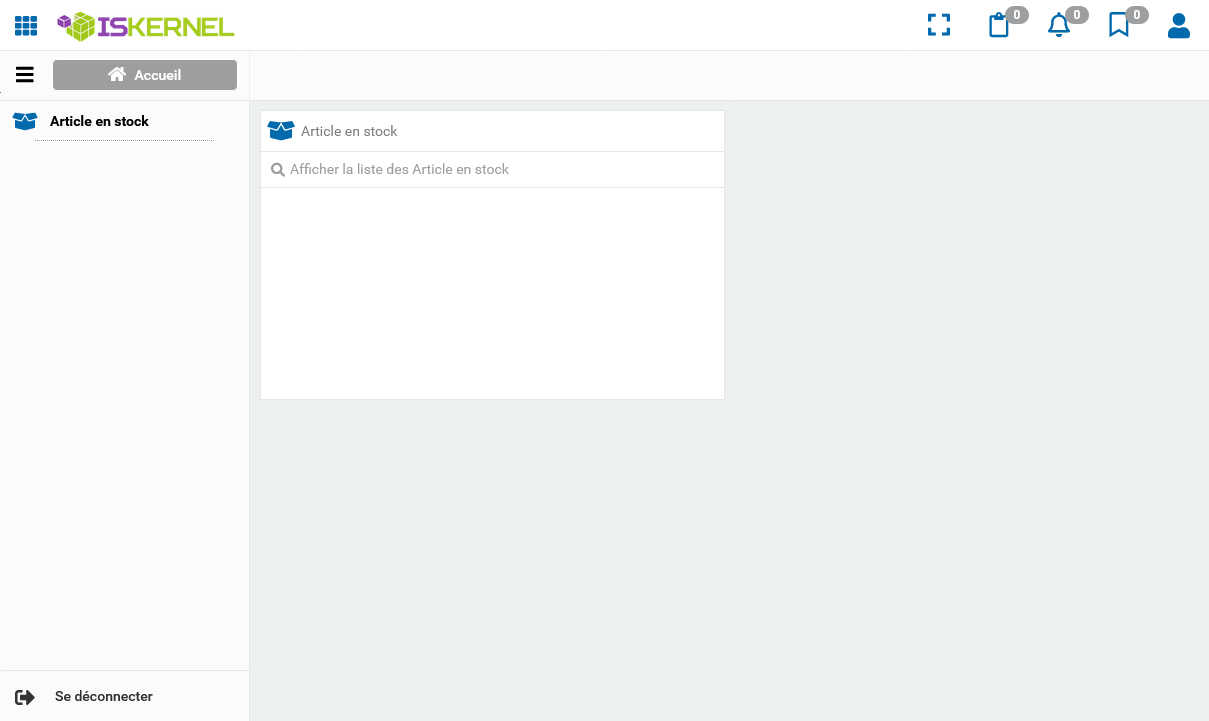 La page d'accueil est mise à jour avec les données par défaut de l'application. En effet, tant que le menu applicatif n'est pas mise à jour à la main, un menu par défaut et des blocs par défaut sont créés dans l'application. Ici la liste des éléments en stock peut être consultée, soit via le menu de gauche, soit via le lien en centre de page.