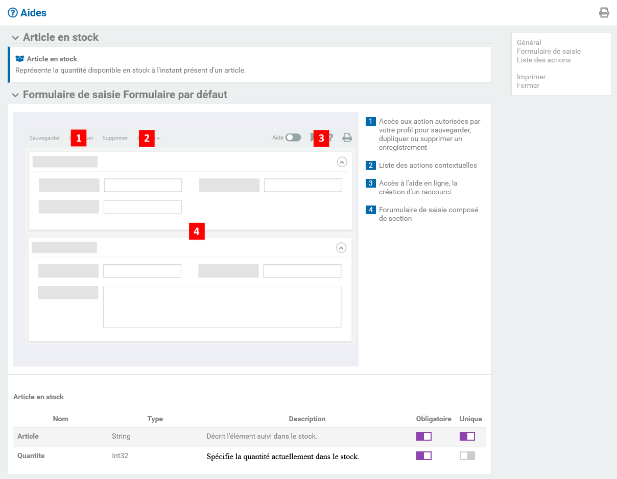 De plus le bouton "?" de la barre d'outil, en haut a droite affiche l'aide en ligne auto générée, enrichie avec les informations entrées dans les différents champs "Texte d'aide" effectués lors du paramétrage.