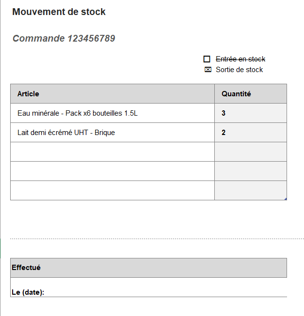 Dans la réalité, un mouvement de stock est souvent réalisé via un papier listant des informations de référence de commande et la liste des éléments rattachés avec une quantité.