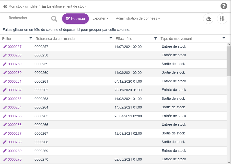 Nous avons terminé de créer une entité "Mouvement de stock" qui représente la partie fixe du document de bon de mouvement, en dehors des lignes avec les articles et les quantités.