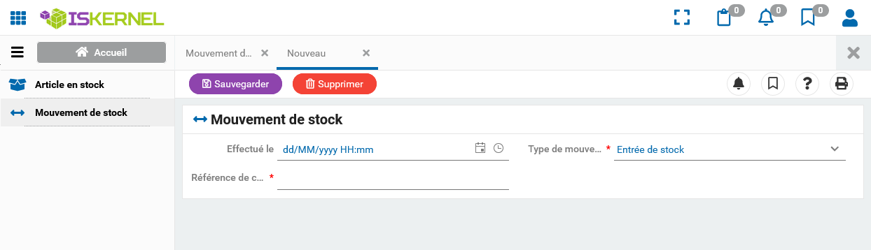 a été automatiquement mis à jour et que le formulaire "Mouvement de stock" a été créé et nous permet de renseigner notre entête de bon de mouvement.