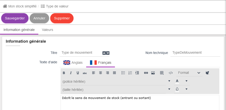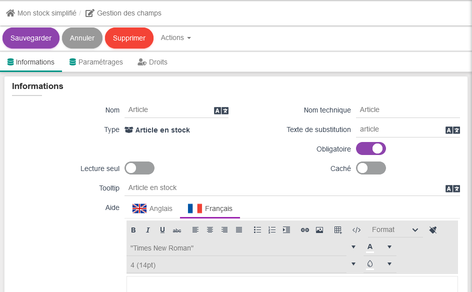 Dans la nouvelle page qui s'affiche, les noms et noms techniques sont repris automatiquement du paramétrage de l'article en stock fait précédement.