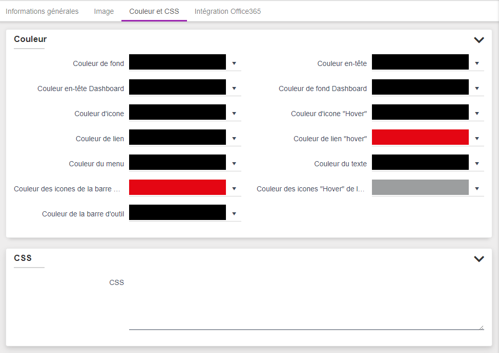 Cette section permet de définir la palette de couleurs utilisée pour l'application ainsi que de surcharge le style css de l'application.