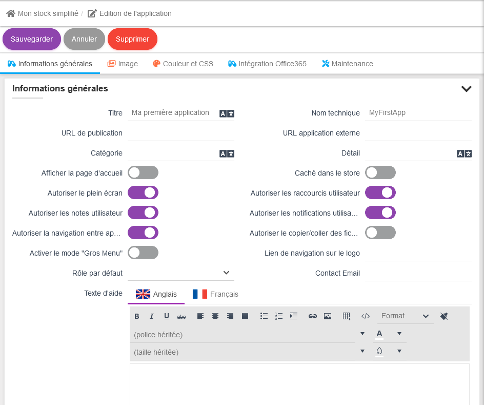 est le nom principal de l'application, ce champ est multilingue et donc, son espect peut changer en fonction des langues sélectionnées sur la plateforme