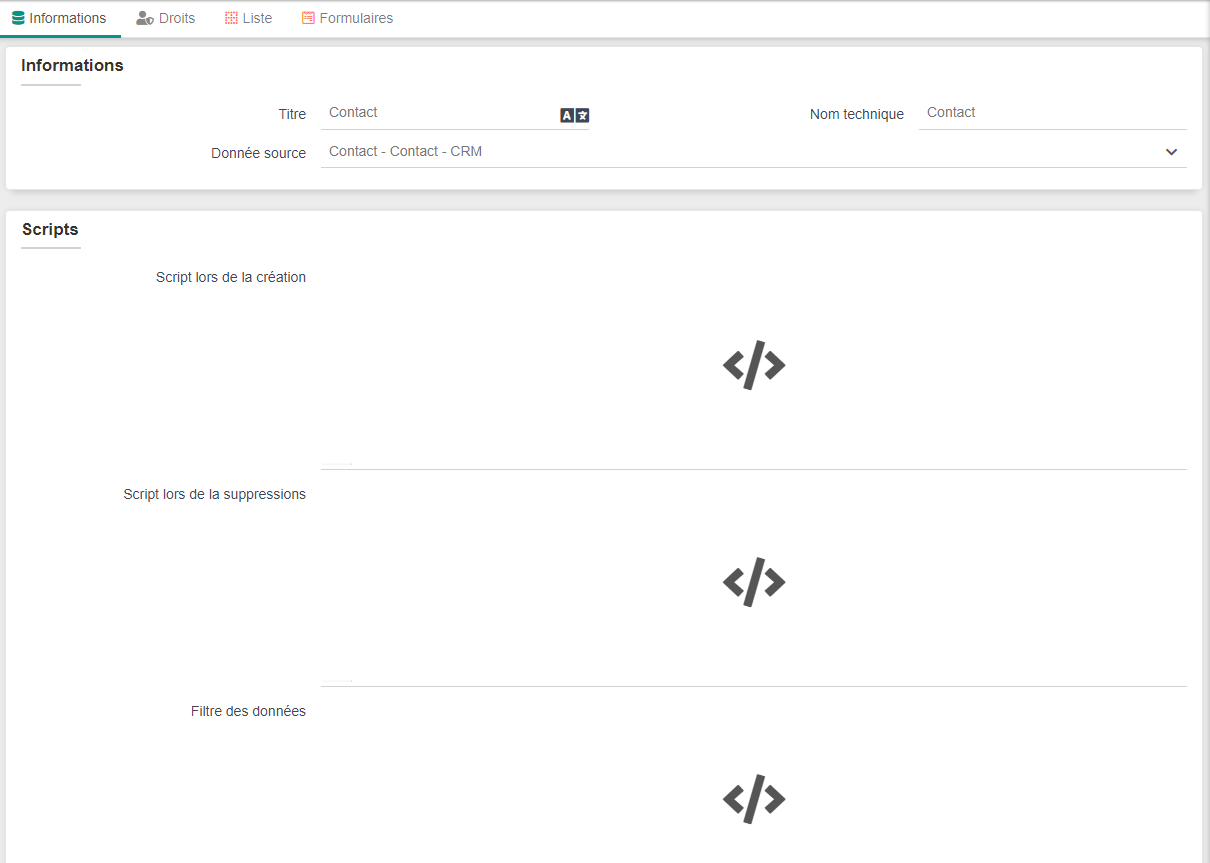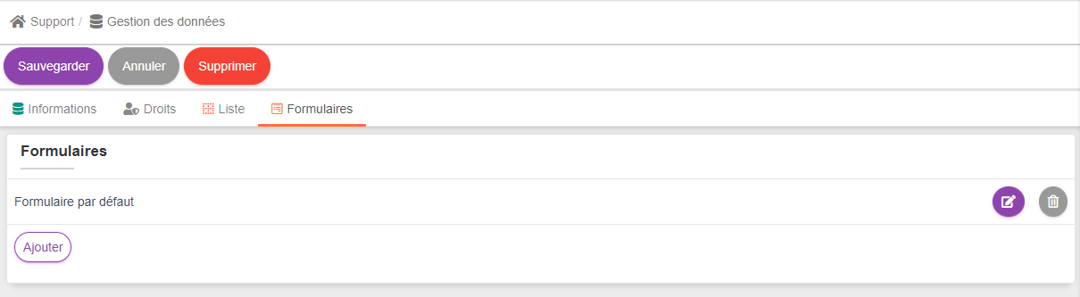 cet onglet permet de créer et d'afficher les formulaires de l'entité.