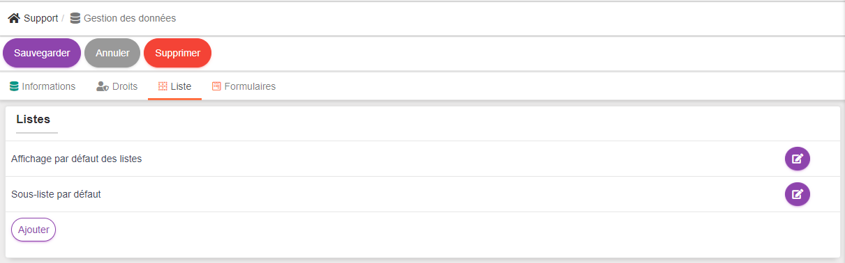 cet onglet permet de créer et d'afficher les listes de l'entité.