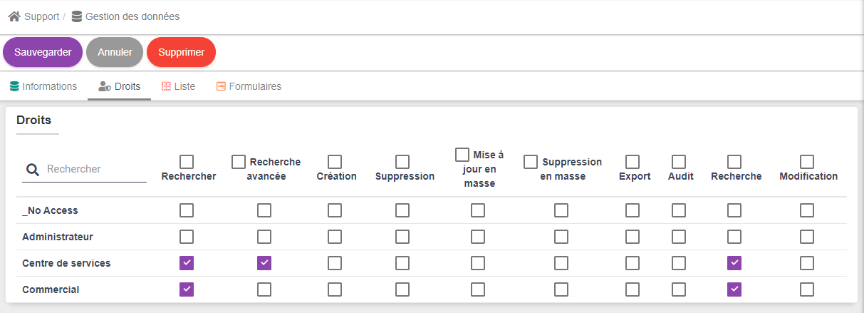 cet onglet permet d'administrer à des profils des droits sur l'entité