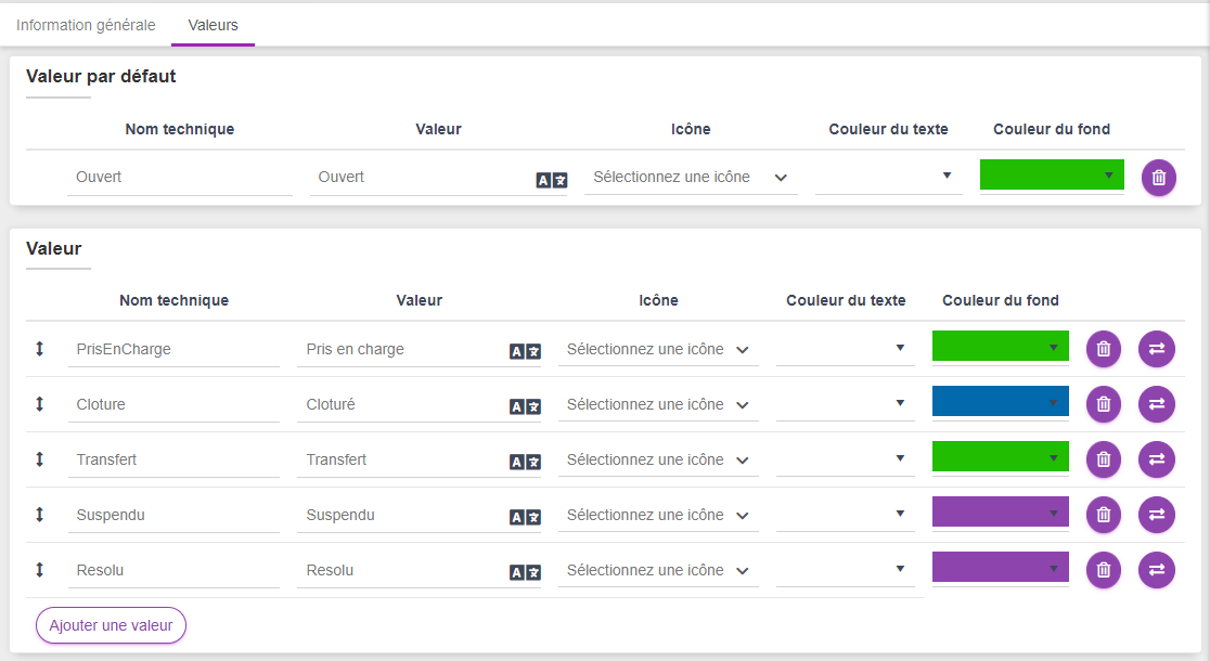 Les types de valeurs sont des données simples sous forme de liste de valeur avec comme seuls champs un binôme clé – valeur. Il est possible de différencier les listes à valeur unique de celles à valeurs multiples. La plateforme permet de bien distinguer les listes des types de valeur à choix unique de celles à choix multiples. Chaque type de valeur peut être utilisé à plusieurs reprises dans une même donnée et souvent.